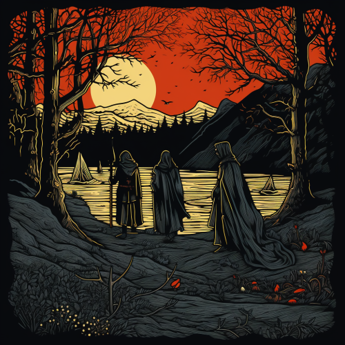 A fantasy Halloween-themed banner for a tabletop role-playing game session. Dark, misty forest under a full moon, eerie twisted trees, glowing jack-o'-lanterns on the ground. In the foreground. A group of medieval adventurers cautiously approach a haunted mansion with dimly lit windows. Bats flying around the moon, black, orange, and purple colors creating a spooky atmosphere. Highly detailed, atmospheric, cinematic lighting, dynamic composition --v 5.0 --ar 16:9
