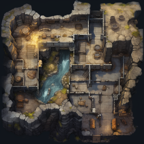 create a large dungeon battlemap, have it in dungeons and dragons style, have it top down view, have a hole in one of the walls on the left of the dungeon, have lots of passageways with walls on either side that lead to different rooms, create areas where there could be traps, have a set of stair on the right side of the map that could lead to lower levels.