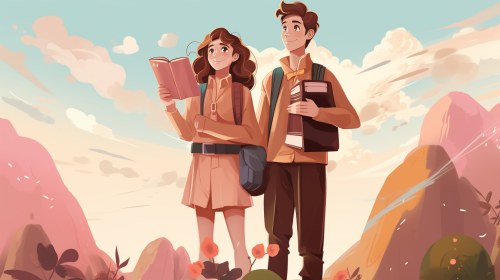 a book cover illustration for a book named adventures of maropan and cara de pan, vector art, dreamy, pastel and earthy tones, wes anderson style --ar 16:9