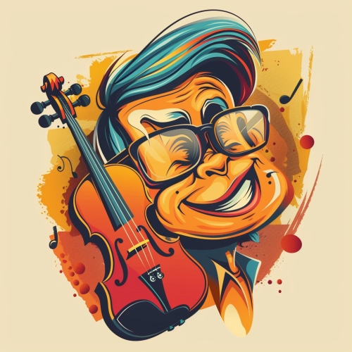 Caricatura promo de un violin amorfo retro funky el violin tiene cara de caricatura, pies y manos, es amigable, estilo politica de los años 70, 80's, tiene cara, ojos, es gracioso con colores retro