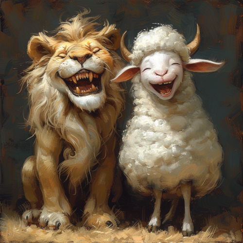 dos generales enfrentados cara a cara. Uno es un león sonriendo con cara de bueno, casi cómico. El otro es una oveja muy fiera con cara de mala --v 6.0 --s 250