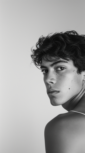fotografia analoga, hombre sin camisa, muchas pecas en la cara, 19 años de edad, fotografia en estudio fondo blanco, f, 2.5 , mamiya rb67 --v 6.0 --ar 9:16