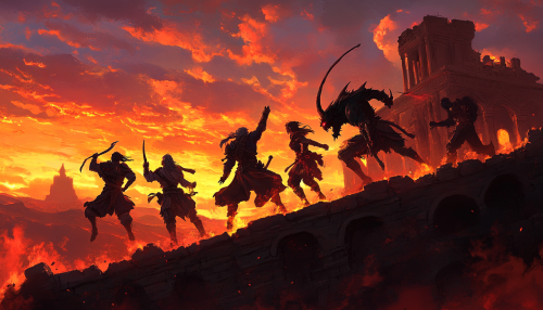 Six, ethnically and racially diverse, D&D style adventurers leaping into battle with a hideous beast. Set beside medieval, persian ruins at sunset. Cinematic lighting, cinematic angles. In the style of a cartoon, anime, Disney, 2D Animation. in the style of studio MAPPA. Ultra delicate brushwork, super resolution, 32k, 1200dpi, meg-apixels, dynamic posing, elaborate, dof, laboratory, hyper maximalist, Anti-Aliasing, Tone Mapping, hyper thick outline, high contrast, Super Detailed HDR, deep black shadows with vibrant, bold colors. Inspired by epic fantasy. --ar 7:4