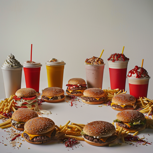 hamburgers, fries, soft drink and milkshake around with an empty space in the middle, full frame format canon, ultrarealistic,--ar 16:9