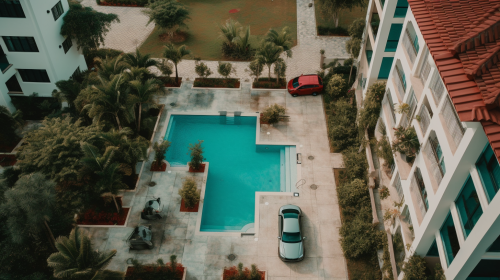 a satelite view photograph of a beachfront two floor villa on the beach of Zanzibar. Villa is built in Mykonos style, with big square windows with black frames. Villa is of light stone color and has a swimmin pool in front