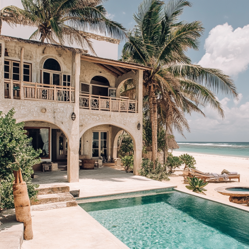 an Ibiza style two story villa in front of a beach in Zanzibar. Villa is of light stone color, has a turquose color swimming pool in front of the beach, and has plenty of coconut trees and vegetation around it