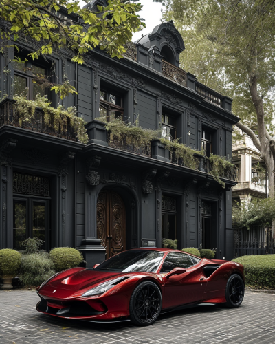 a black villa in italy, and a red ferrari car in front of it. --ar 4:5 --stylize 250 --v 6.0