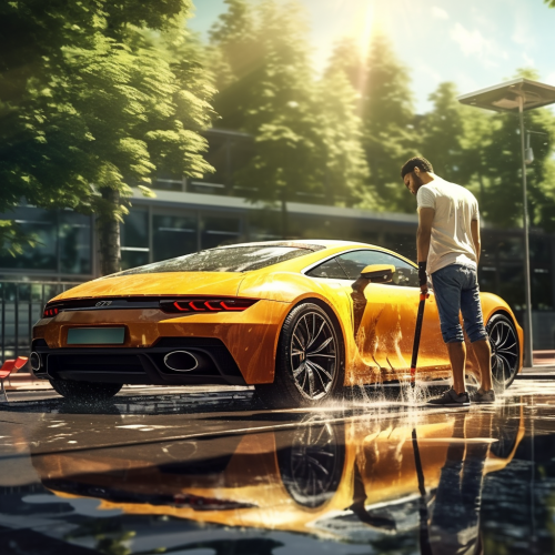 car washing brush, boy washing luxury car, cinematic, outdoor, realistic, detailed effects, car washing brush in detail