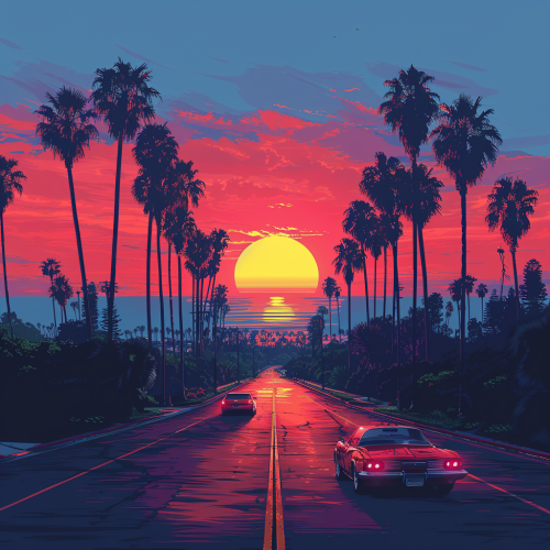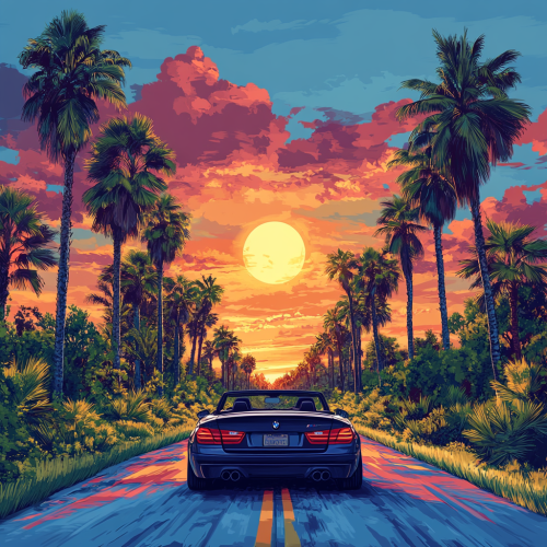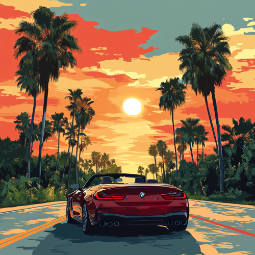 an illustration of a view of the horizon of a road from a black bmw convertible, the sun is shining in front, full of light illuminating the sky, some palm trees around the road adobe illustrator style --v 6.0 --s 750