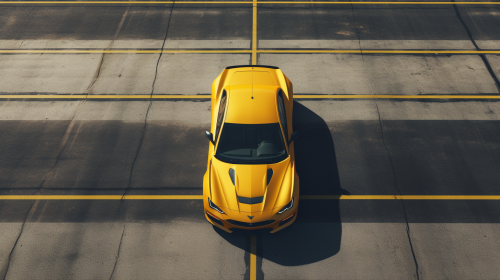 top view, single car on empty tarmac, wide shot, photorealistic, photography, commerical color grading, 8k --ar 16:9