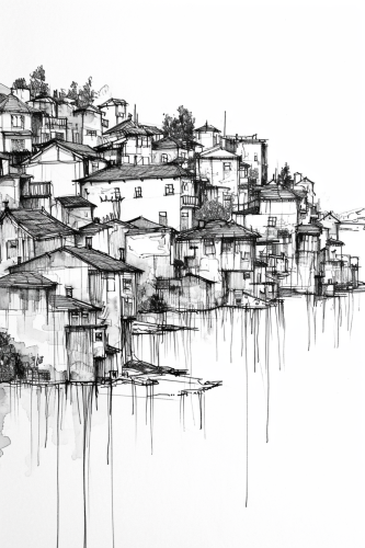 I need a black-and-white realization vectorized from the blocks of houses that I've queried, a bit graffiti style with people and thick bass speakers in the foreground below