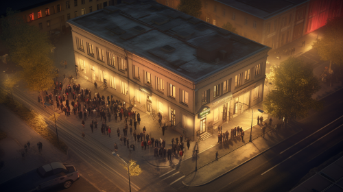 dutch aerial view of outside the club Berghain, dawn time, some people queueing outside the club, realistic photo style, photorealitic, crisp detailed --ar 16:9 --s 50