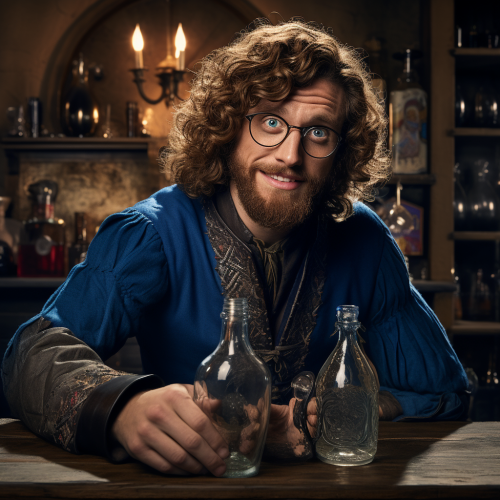 Man Elf, round glasses, fantasy, steampunk, white dreadlocks, mad smile, Anime style, black, neon, --v 6.0 --ar 1:1