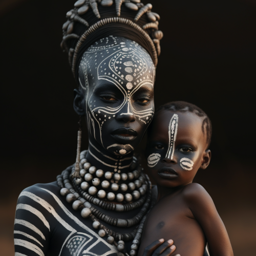 african mom with a baby on her back and black and white tribal makeup --v 5.2