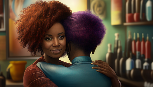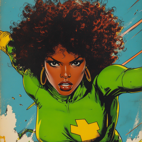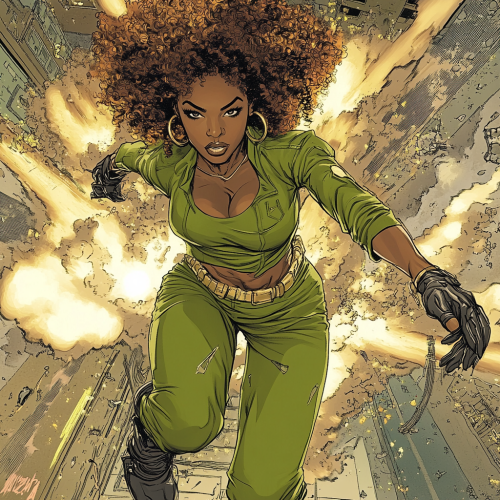 Comic book wide establishing scene of curly african american women being saved by an African American woman superhero with voluminous natural curls (4A texture), rich brown skin, wearing a fitted green jumpsuit platform boots, large hoop earrings blasting superpowers while flying. Scene should show the environment they are in