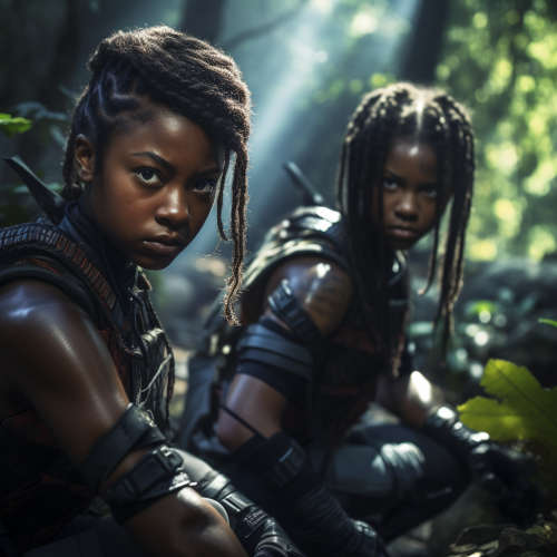 photo depicting young african american girls posing in combat positions dressed as master martial artist. Outside arena sounded by trees. Award-winning Photography style, accentuated by vibrant contrasts, highlights the multidimensional nature of this extraordinary individual. 8K, Ultra-HD, Super-Resolution