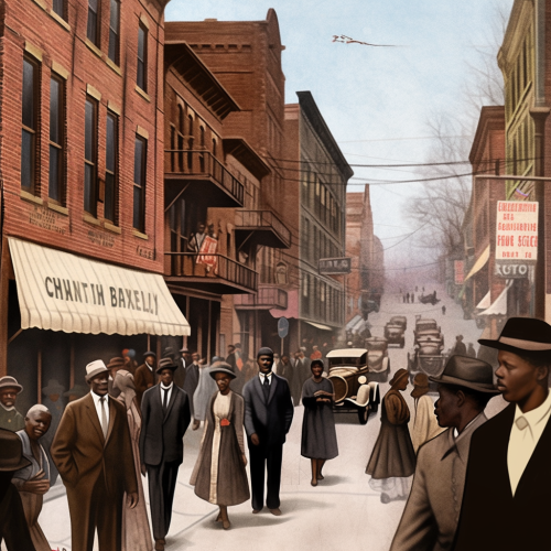 black wall street in durham nc . showing a black woman and black man standing in the middle of black wall street with other people walking by them. the setting is early 1900s --niji 5