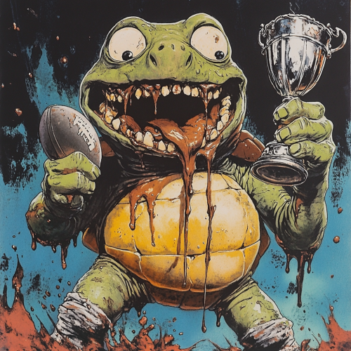 A 1980s style Garbage Pail Kids card with an angry turtle that is holding a silver trophy and a football, with brown tgurds dripping down his body, funny, disgusting, gross, garbage pail kids, football