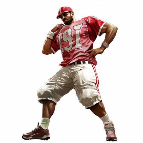 an american football fan wearing a red and white jersey dancing, hands on hips, knees bent, getting low, serious face, photorealistic, white background
