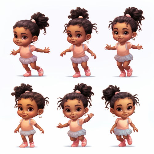 an african american 3 year happy big afro hairs girl. Multiple poses and expressions. full body. white background. 3D disney art style.