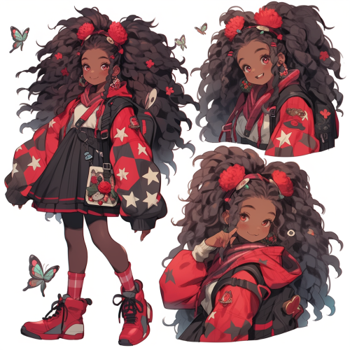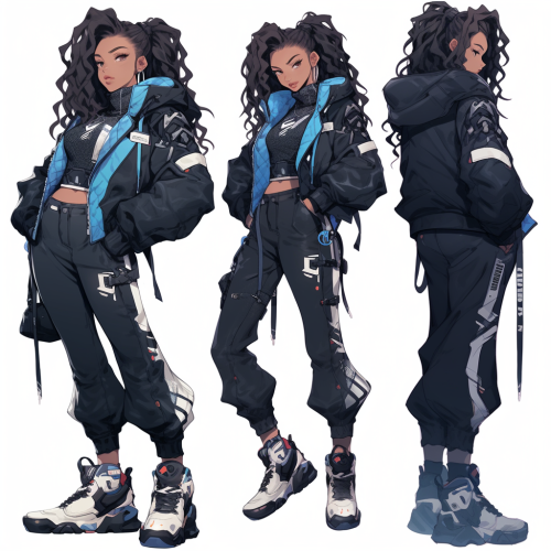 Character concept on white background, black American girl Cyberpunk Spiderwoman character illustration, multiple poses and expressions, full body front and back views --s 400 --niji 5