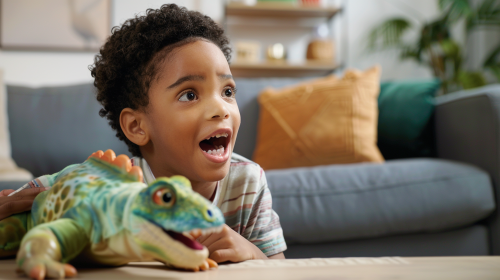 photorealistic image of an african-american child, age 9, in his home living room having fun looking directy at and speaking directly to a funny-looking 24 inch plush squishmallow-style toy lizard which is looking at and speaking to the child. In the background is overlay imagery representing magical imagination and wonderment. Ambiance of the image is one of fun childhood, imaginative play, and positivity. --ar 16:9