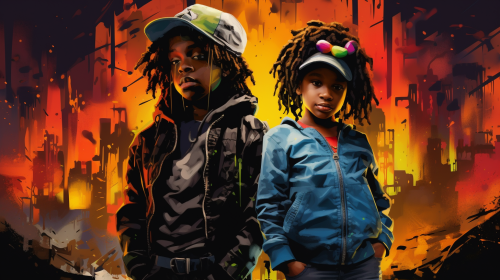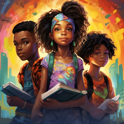Dramatic Illustration of African American children with colorful background elements.book cover format