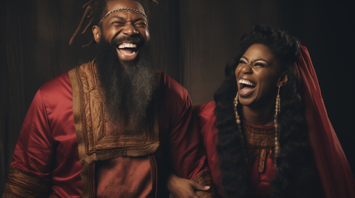 hd hyper realistic large group of African American men with beards and African American woman in modest biblical garments with headwraps on the women’s head laughing --ar 16:9 --v 5.2