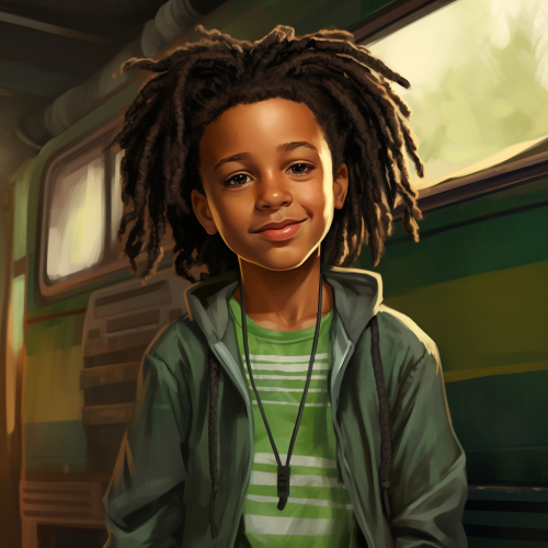 a 10 year old African American boy with dreadlocks, green clothing, ambitions joyfully look, children book illustration