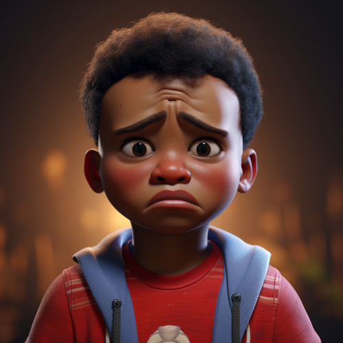 an african american little boy character sad face expresion. Disney children 3D art style.