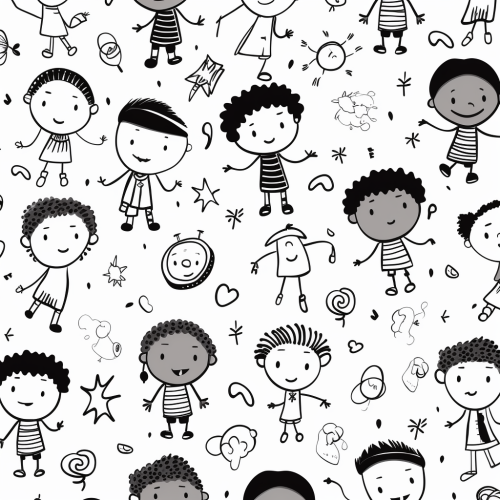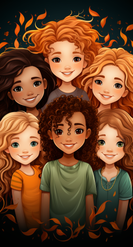Kerby Rosanes illustration, abstract doodle, Children from different ethnic origins, asian, latin, american, native american, caucasian, african, arabic, red hair, albin, dark solid background, 8k --c 100 --s 1000 --ar 7:13 --style raw