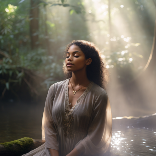 Ethereal image of African-American woman as A solo camper in a serene forest clearing, a gentle stream of smoke blending with the morning mist around them.