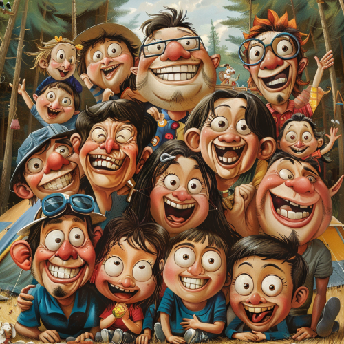 picture of a lot of families with kids, all looks happy and have funny and goofy faces. Background is a campsite with tents