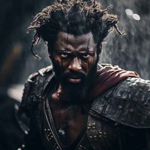 Cinematic still , zealous, , short Afro hair, bold,angry, aggressive muscular dark skin man with beard, african American , cinematic still , realism , depth of field , black samurai skilled warrior art of samurai from Japan o African descent , samurai culture context--ar 16:9 --v 5.2