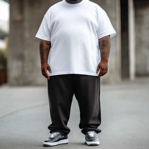 overweight African American man wearing a premium quality white T shirt with straight leg, black, cotton fleece pants, and Air Force One shoes with pants leg slightly covering the shoes, street wear style.