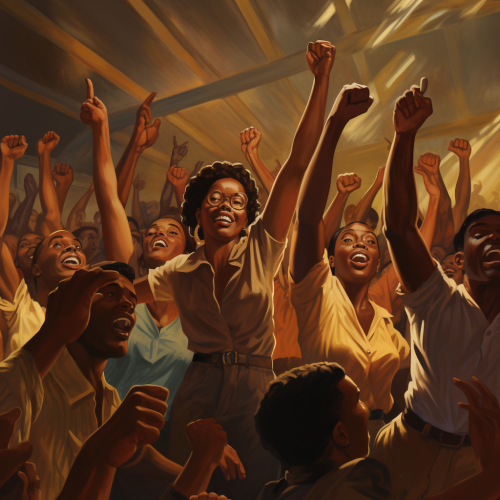 young black people dancing in modern dance hall in the style of ernie barnes black arts movement, with the people have their hands up pointing towards the sky having fun and smiling as an oil painting style 1080 by 1080