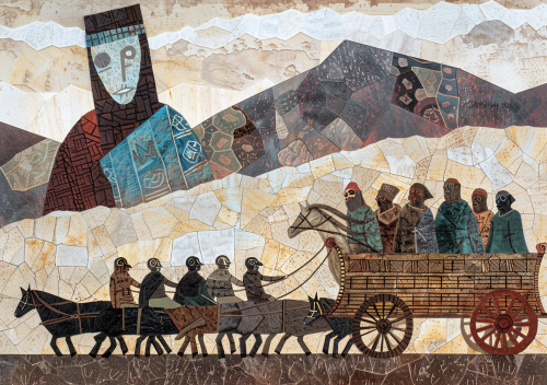 An ancient engraving of migrating tribes in 300 AD, families and warriors travel across a barren landscape, wooden carts, cattle, and rocky mountains in the background. A tall, dark figure with a white, emotionless mask is hidden within the shadows of a wagon. Engraving style: intricate stone relief carving, detailed textures, subdued lighting, historical accuracy --ar 140:99 --v 6.0