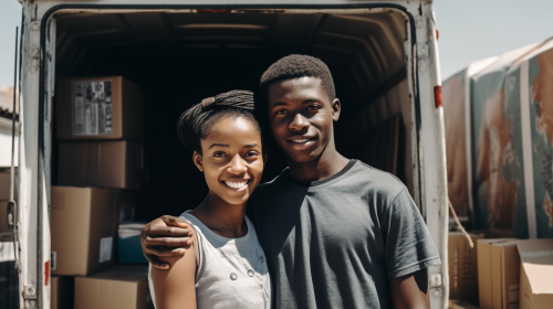 happy african man and woman moving boxes and furniture in new home, township house south africa, Daylight, clean aesthetic, fujifilm --ar 16:9 --v 5.0