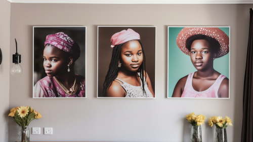 african photos of wedding celebration hanging on a wall in township family home, varsity bedroom, township house south africa, Daylight, clean aesthetic, fujifilm --ar 16:9 --v 5.0