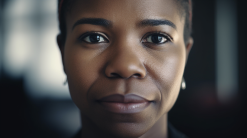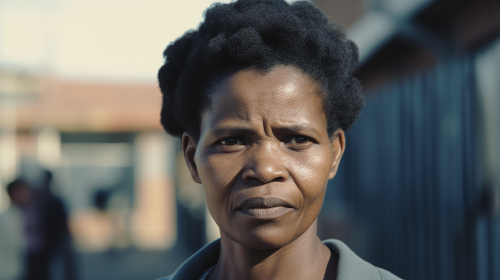Photograph of african 40 year old woman standing in a office township south africa, looking in camera, hyperrealistic image, Daylight, clean aesthetic, fujifilm --ar 16:9 --v 5.0
