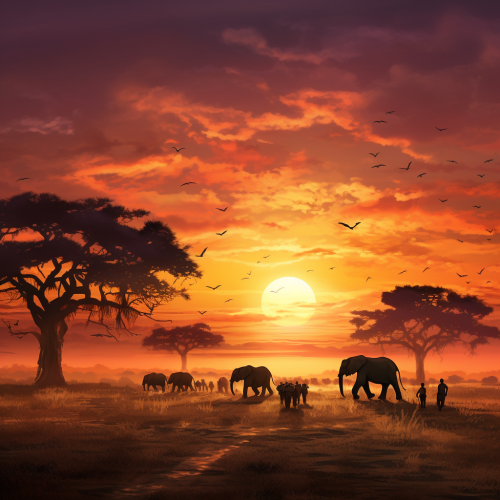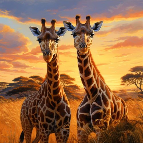 A realistic oil painting illustration portrait of two giraffes in the African savanna at dusk. v 6.0