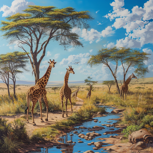 A realistic oil painting illustration of giraffes walking through the African savanna with acacia trees and a stream in the landscape. --v 6.0