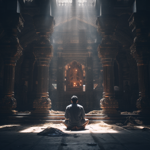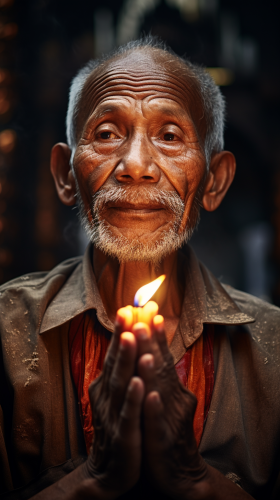 [b197d3276] an old man praying at a temple in cambodia, in the style of 8k resolution, portraits with soft lighting, uhd image, dark amber and gray, colorized, captivating portraits, close-up intensity --v 5.2 --ar 9:16 --c 0