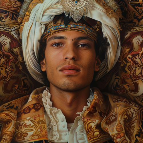 hyper-realistic portrait of a Calif dressed in traditional attire, adorned with intricate patterns and rich fabrics, capturing the essence of cultural pride, history, and authority in their gaze. Art Style: Hyper-Realism --v 6.0