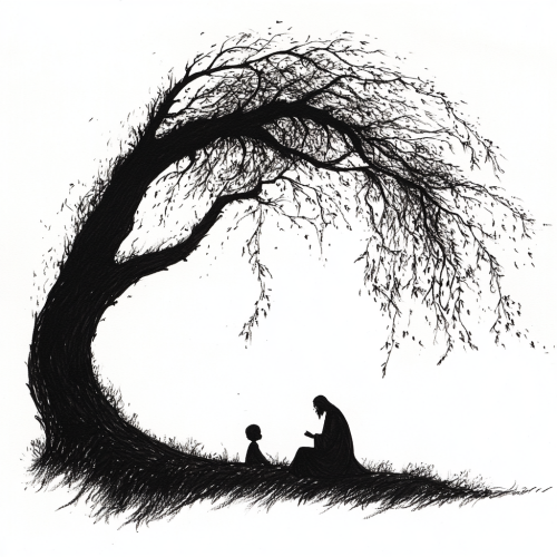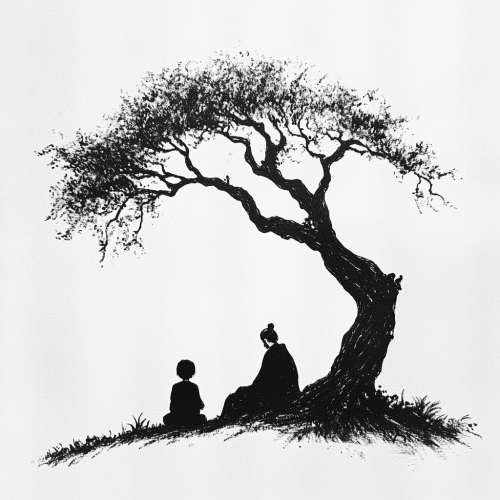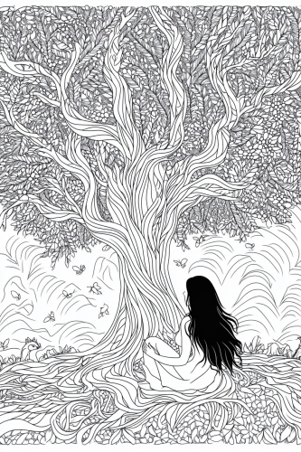 coloring page, black and white, thick bold lines, of a woman resting under a giant, intricately detailed tree with roots and branches weaving into mandala shapes. The background could feature softly flowing leaves, forest animals peeking through, and calming nature patterns like rippling water or stylized mountain lines --ar 2:3