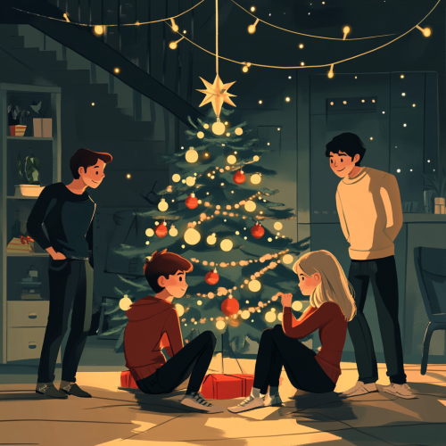 illustration of a Christmas with three teenagers sitting at the base of the Christmas tree and their parents standing together in the background. digital art style,simple