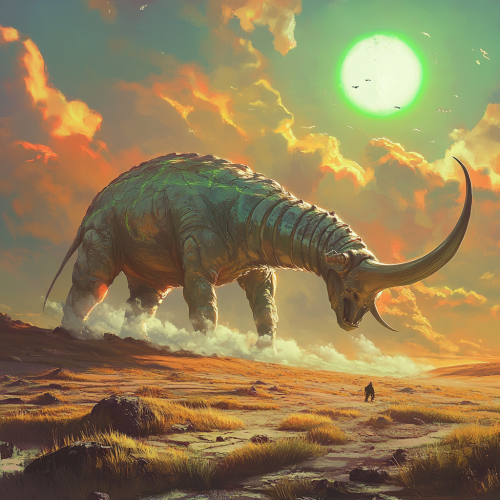 a massive Artiodactyla type animal so large it can reach the clouds. It is slowly striding the plains of an alien world with a bright sunny day, the sun is a green hue and the sky saturating in oranges and purples