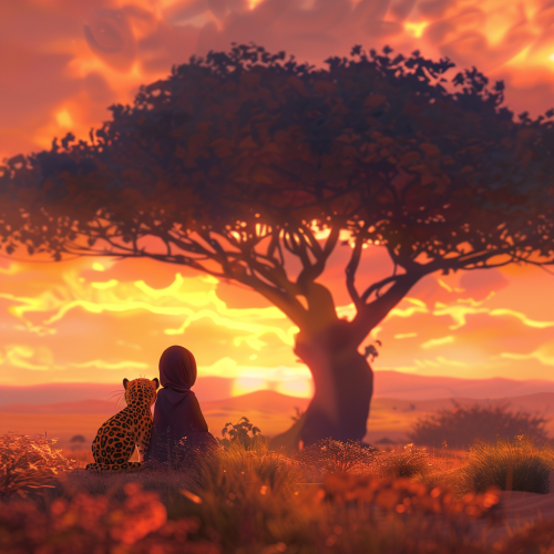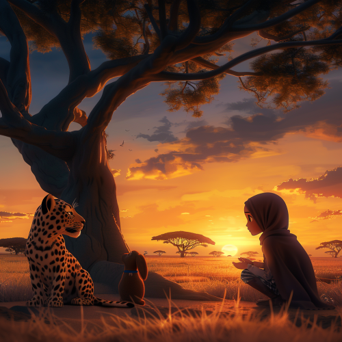 A cartoon of a young african girl and an adorable leopard sitting under an acacia tree. The african girl is wearing a hijab. Background is the african savannah. Pixar style. Cinematic UHD.