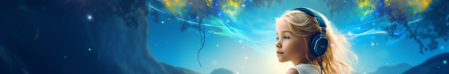 a 10 yr old blonde girl wearing headphones and a blue dress sitting under a big tree, vibrant colors, ultra real, 8k --ar 1800:300