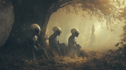 3 small grey alien (all males, wearing turtleneck black bodyfit jumpsuit, and with pale greyish skin, huge dark eyes) sitting under a big oak tree and talking to a group of young people, in a friendly manner. Friendly contact, initiated by humans. --ar 16:9 --p 4h3co63